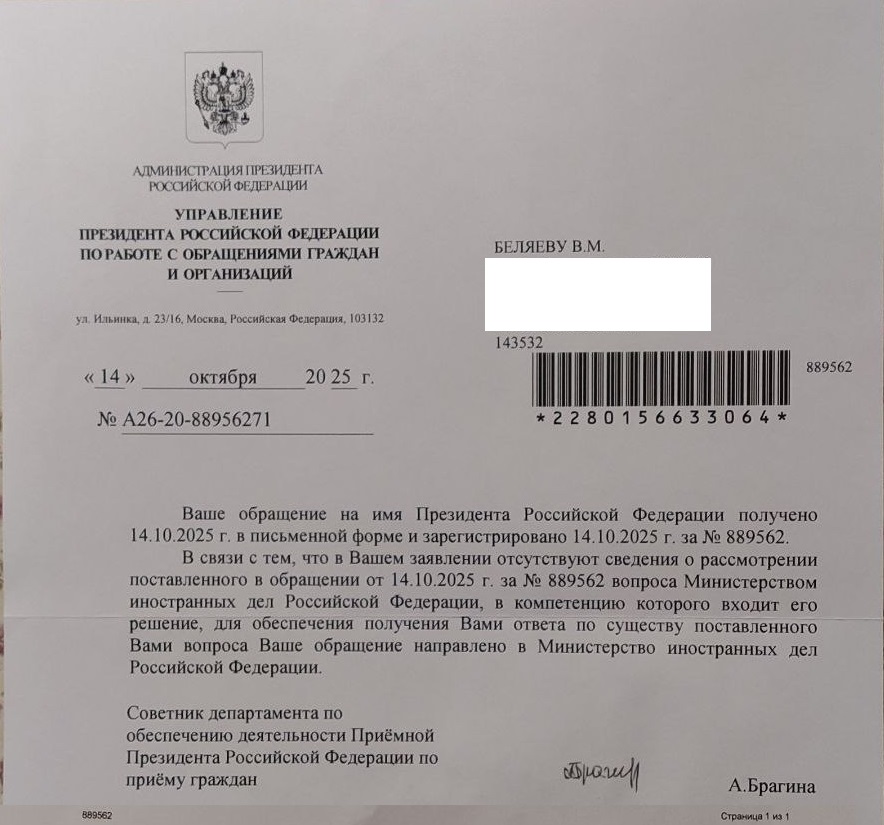 РОССИЙСКОЙ ФЕДЕРАЦИИ УПРАВЛЕНИЕ ПРЕЗИДЕНТА РОССИЙСКОЙ ФЕДЕРАЦИИ ПО РАБОТЕ С ОБРАЩЕНИЯМИ ГРАЖДАН И ОРГАНИЗАЦИЙ БЕЛЯЕВУ В.М. < 14 » октября 20 25 г. No A26-20-88956271 Ваше обращение на имя Президента Российской Федерации получено 14.10.2025 г. в письменной форме и зарегистрировано 14.10.2025 г. за No 889562. В связи с тем, что в Вашем заявлении отсутствуют сведения о рассмотрении поставленного в обращении от 14.10.2025 г. за No 889562 вопроса Министерством иностранных дел Российской Федерации, в компетенцию которого входит его решение, для обеспечения получения Вами ответа по существу поставленного Вами вопроса Ваше обращение направлено в Министерство иностранных дел Российской Федерации. Советник департамента по обеспечению деятельности Приёмной Президента Российской Федерации по приёму граждан А.Брагина Страница 1 из 1 |