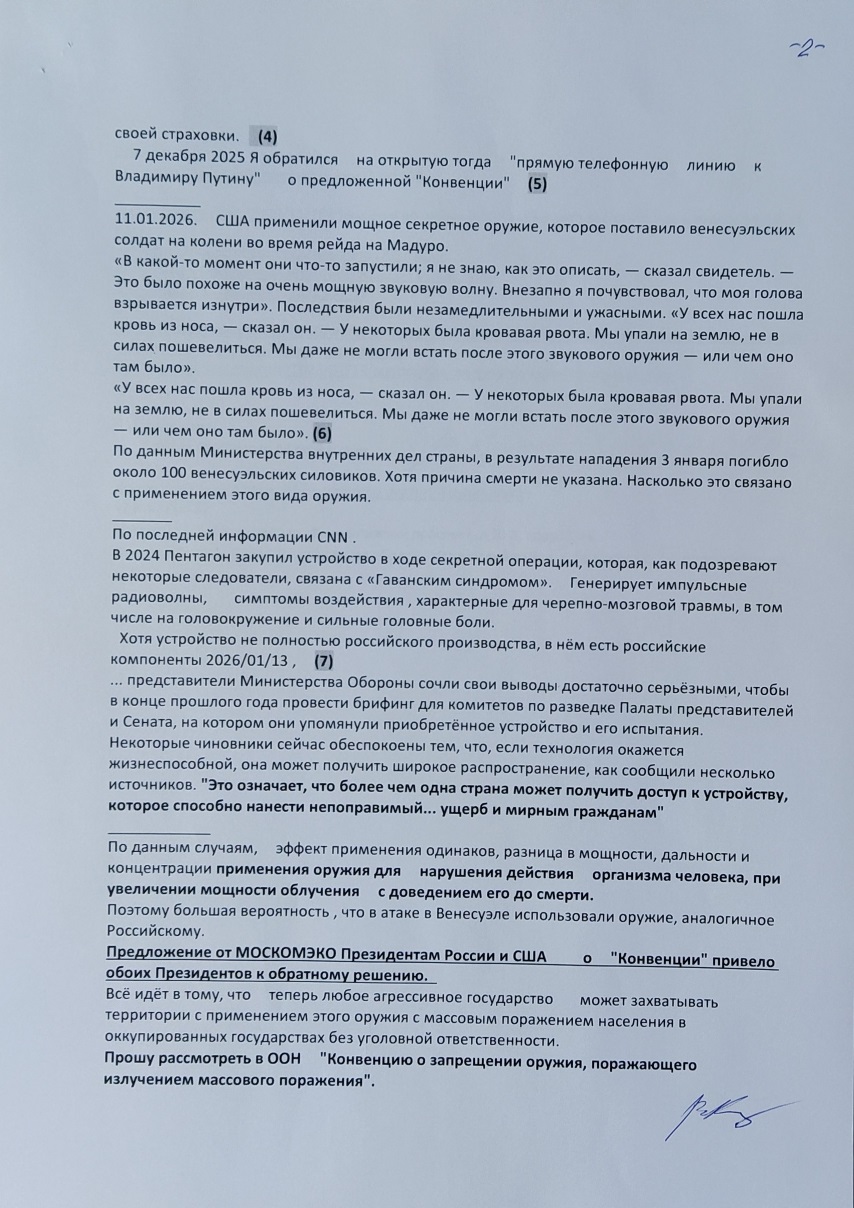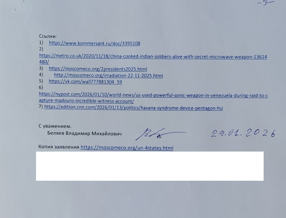 В ООН, Президенту США Дональду Трампу, Президенту РФ Владимиру Путину, Председателю КНР Си Цзиньпин, Президенту Индии Драупади Мурму. Об официальном применении и распространении нового оружия массового поражения. 26.08.2017. Власти США впервые официально подтвердили, что в результате внешнего воздействия, источник которого не установлен, на Кубе пострадали 16 американских дипломатов и членов их семей. Госслужещие жаловались на тошноту, головокружение и потерю слуха. (1) ========================== 17.11.2020. Китайские военные применили «инновационное высокомощное микроволновое оружие», когда индийские солдаты контролировали вершины гор в Ладакхе. «Через 15 минут всех, кто был на этих вершинах, начало тошнить и рвать. Остановиться они не могли, поэтому бежали оттуда»,— подытожил профессор Цзинь Цаньжун, подчеркнув, что ни одного выстрела при этом китайские солдаты не сделали. The Times сообщает, что этот инцидент может стать первым случаем применения микроволнового оружия против вражеских войск , а также для причинения вреда людям. (2) Есть подозрения, что они были использованы против американских дипломатов и членов их семей в китайском городе Гуанчжоу в 2018 году, а также могли стать причиной симптомов, о которых сообщили американские и канадские посланники, отправленные в Гавану двумя годами ранее. ======================= 22-11-2025 Я, Беляев В. М. от МОСКОМЭКО подал Президенту США Дональду Трампу, Президенту РФ Владимиру Путину предложение "Конвенции о запрещении оружия, поражающего излучением массового поражения". (3) После получения от МИД РФ пустого ответа 11 ноября 2025 и моего отрицательного комментария на сайте, 22 ноября ранним утром 7 часов у меня началось сильное дистанционное облучение головы. Звон в голове в самом мозгу, макушке. В сердце отдаёт. С 7 часов. Потом 7:30 начался шум в голове как звук мотора холодильника, и музыка, человеческий говор. Голова прогревается. Потом нагрев пошел вниз по затылку и сильное давление изнутри на перепонки ушей. Боли в животе, спазмы. Пошёл и внешний шум, около 1 кГц и вторая частота пониже и потише. Почти оглох, так было около трех часов. Состояние было фактически предсмертное, внутреннее кровоизлияние в мозг. Но кот в комнате в то время двигался как обычно. Ушёл из дома. Потом стал немного слышать, но боли ещё были. Почти неделю были боли в голове, звуки говор и музыка, и резонанс. Будто эхо, голова в бочке. Когда началось сильное облучение я сфотографировался и отправил по е-мэйл первым, кто был тогда в переписке c МОСКОМЭКО, Geneva Forum contact@geneva-forum.com ... Для своей страховки. (4) 7 декабря 2025 Я обратился на открытую тогда "прямую телефонную линию к Владимиру Путину" о предложенной "Конвенции" (5) ======================= 11.01.2026. США применили мощное секретное оружие, которое поставило венесуэльских солдат на колени во время рейда на Мадуро. «В какой-то момент они что-то запустили; я не знаю, как это описать, — сказал свидетель. — Это было похоже на очень мощную звуковую волну. Внезапно я почувствовал, что моя голова взрывается изнутри». Последствия были незамедлительными и ужасными. «У всех нас пошла кровь из носа, — сказал он. — У некоторых была кровавая рвота. Мы упали на землю, не в силах пошевелиться. Мы даже не могли встать после этого звукового оружия — или чем оно там было». «У всех нас пошла кровь из носа, — сказал он. — У некоторых была кровавая рвота. Мы 